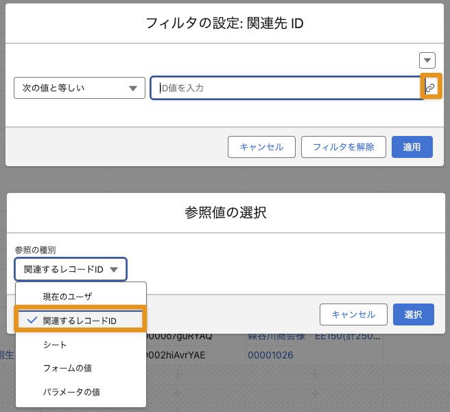 2.追加した「関連先ID(WhatId)」の列メニューから、今度は「フィルタ」を選択し、参照値選択ボタンをクリックする。「参照の種別」の選択リストから「関連するレコードID」を選択し、フィルタを適用