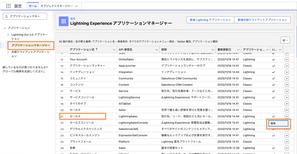 2.セールス(API参照名:LightningSales)の右側にある「▼」をクリックし「編集」をクリックするとLightningアプリケーションビルダーが開く