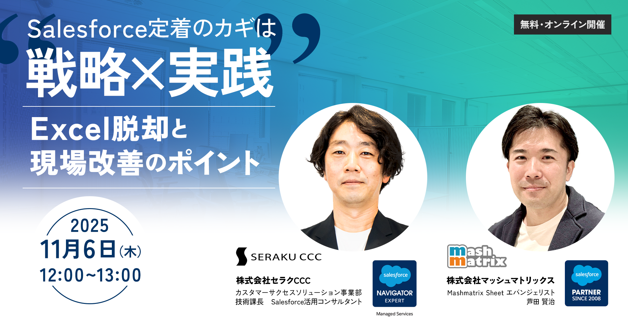本セミナーでは、Salesforceを熟知した2社が「Excel管理に戻らないための戦略」と「現場で定着させる実践方法」をディスカッション形式で解説します。さらに、実際に成果を上げた企業の成功事例もご紹介します。
