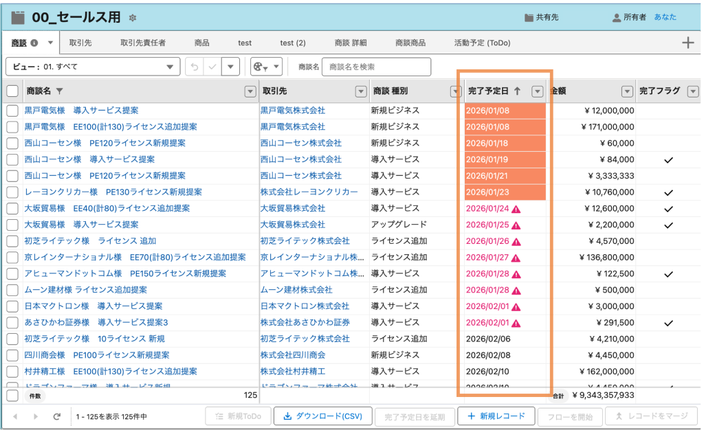案件管理を行う際に重要なのは、設定した完了予定日に間に合うように計画的に進捗を進めていくことです。しかし、完了予定日が過ぎていても気づかず、案件を放置していた…なんてことはありませんか?もし、完了予定日を過ぎている商談があれば、すばやく気付き適切なフォローアップを行いたいですよね。