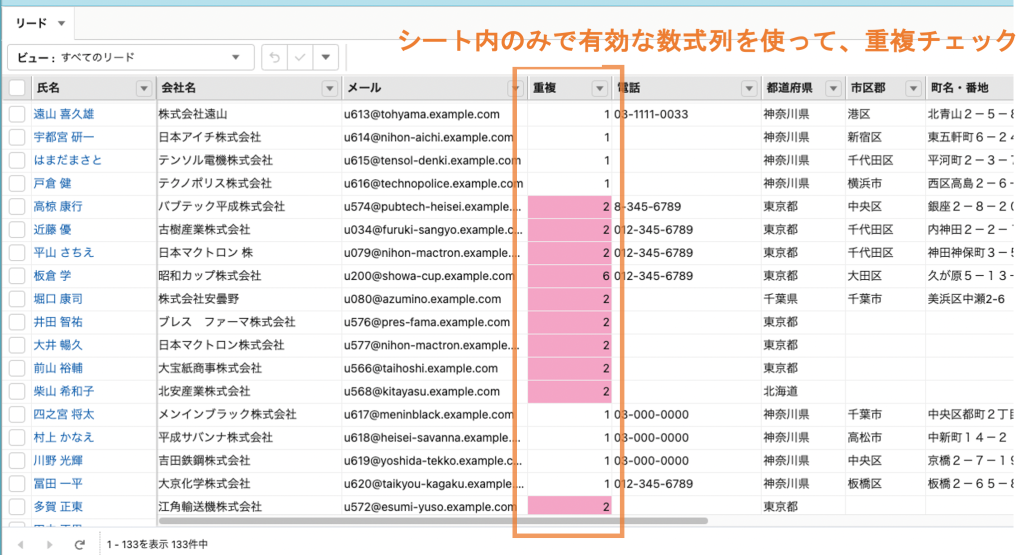 Mashmatrix Sheetの数式機能を利用すれば、リードや取引先責任者の重複レコードの有無をすばやくチェックできます。書式設定で色付けすれば、重複データをさらに把握しやすくなるので、オススメです!