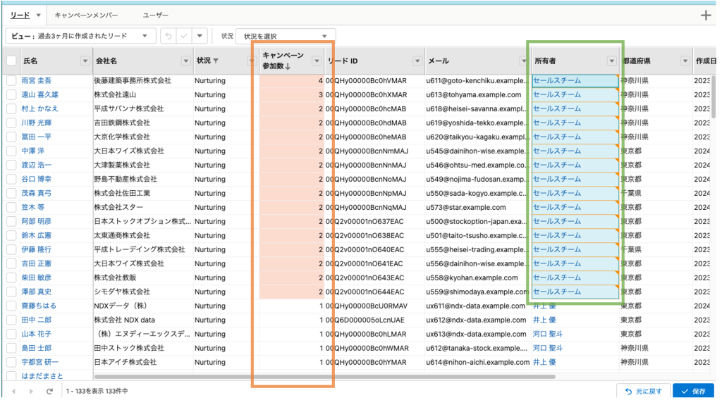 また、MQLリードをセールス部門に引き渡す際は、レコードの所有者をExcelライクに一括編集するだけで完了。(上画像緑枠: 例として「セールスチーム」に値を一括変更しています)インサイドセールス部門や営業部門との連携の強化も期待できます。